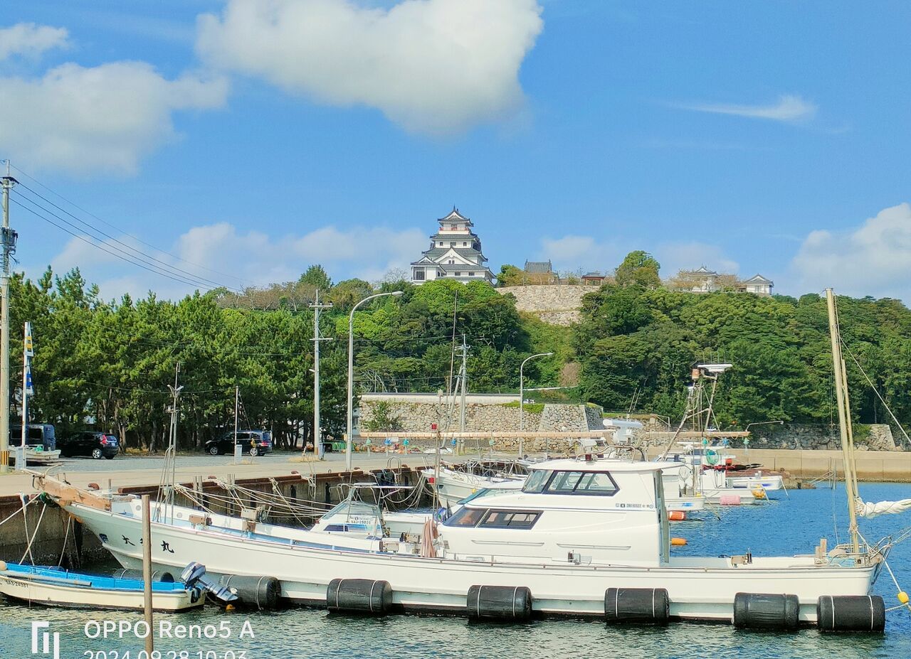出艇場所の右側にシーサイドホテルで左側は唐津城🏯